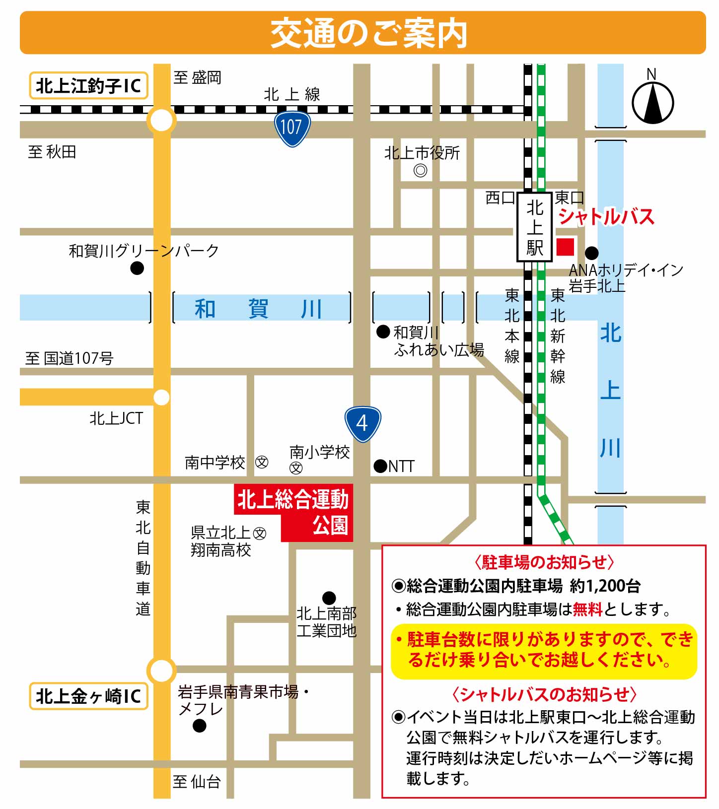 ハーフ会場へのアクセス 電車の場合 東北本線北上駅下車 タクシーで15分 自動車の場合 東北自動車道北上金ヶ崎ICから車で約5分 東北自動車道北上・江釣子ICから車で約15分 シャトルバスの場合 ※準備中